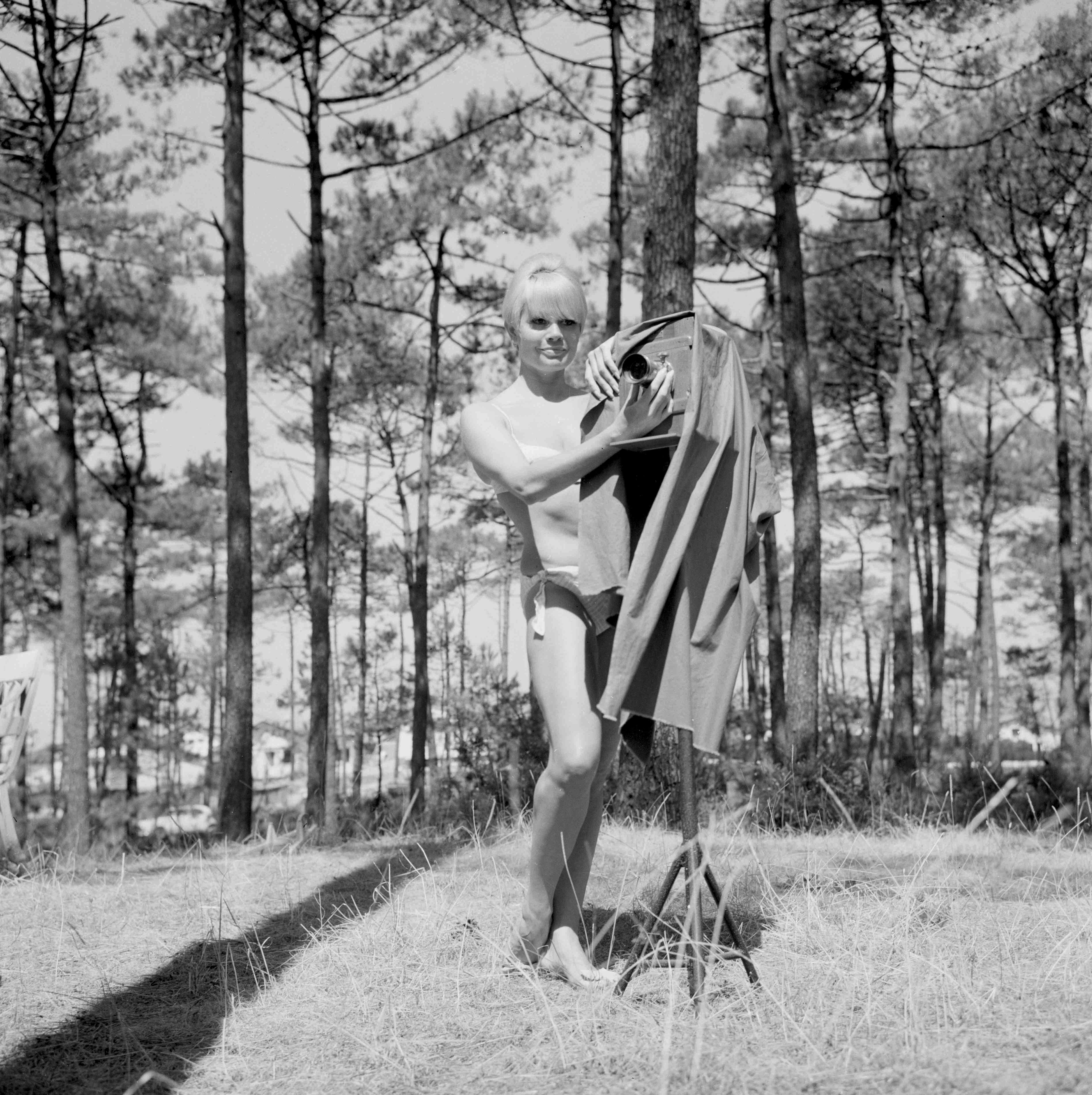 Noëlle Adam en bikini, photographiée dans la forêt de Chiberta, Biarritz, France, 1966